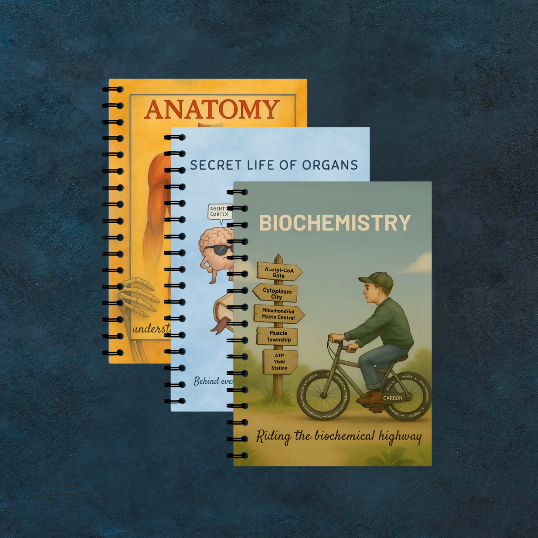 This combo of three clean, unruled notebooks is themed for the holy trinity of your MBBS first year — Anatomy, Physiology, and Biochemistry. Designed to keep your concepts clean and your desk aesthetic, without the clutter.